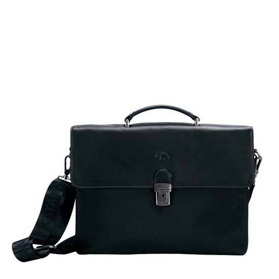 Ce cartable un soufflet en cuir de vachette et nylon peut se porter à la main ou grâce à sa bandoulière amovible et garnie cuir. Il dispose à l'intérieur d'un grand compartiment ainsi que de divers espaces de rangement pour stylos, porte-clés et téléphone portable.