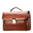 Ce cartable deux soufflets en cuir de vachette collet peut se porter à la main ou sur l'épaule grâce à sa bandoulière amovible. Il dispose à l'intérieur de deux compartiments et d'une poche à fermeture éclair ainsi que de divers espaces de rangement pour stylos, porte-clés et téléphone portable.