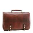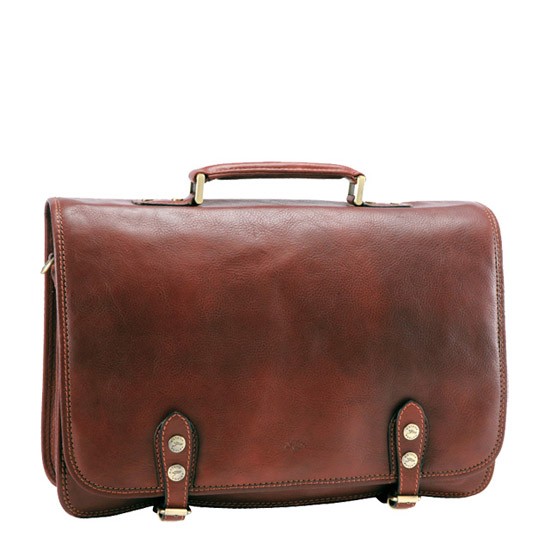 Ce cartable deux soufflets en cuir de vachette gras peut se porter à la main ou sur l'épaule grâce à sa bandoulière amovible. Il dispose à l'intérieur de deux compartiments et d'une poche à fermeture éclair ainsi que de divers espaces de rangement pour stylos, porte-clés et téléphone portable.