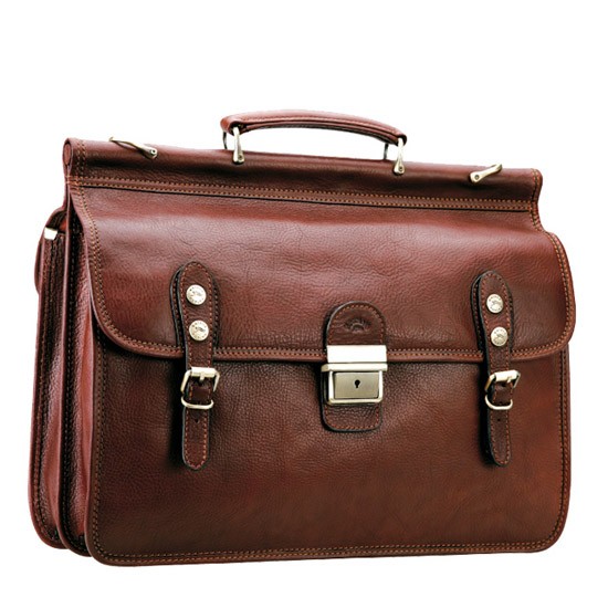 Ce cartable deux soufflets en cuir de vachette gras peut se porter à la main ou grâce à sa bandoulière amovible. Il dispose à l'intérieur de deux compartiments et d'une poche à fermeture éclair ainsi que de divers espaces de rangement pour stylos, porte-clés et téléphone portable.