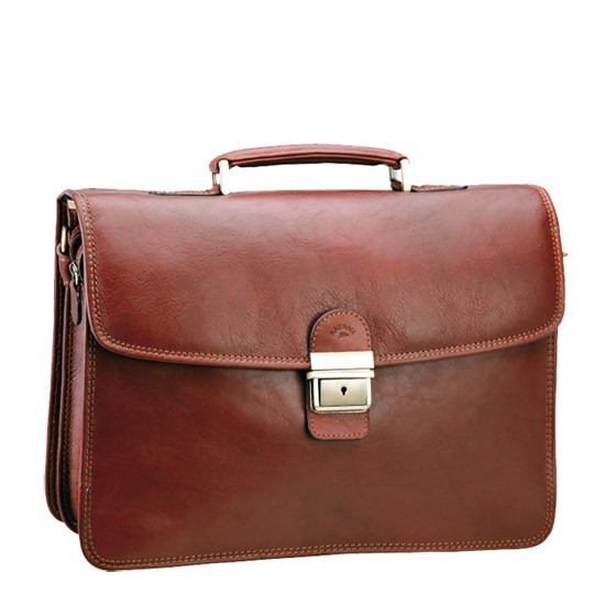 Ce cartable trois soufflets en cuir de vachette gras peut se porter à la main ou sur l'épaule grâce à sa bandoulière amovible. Il dispose à l'intérieur de trois compartiments et d'une poche à fermeture éclair ainsi que d'espaces de rangement pour stylos, porte-clés et téléphone portable. Des poches supplémentaires dont plusieurs à fermeture éclair se trouvent de chaque côté du cartable.