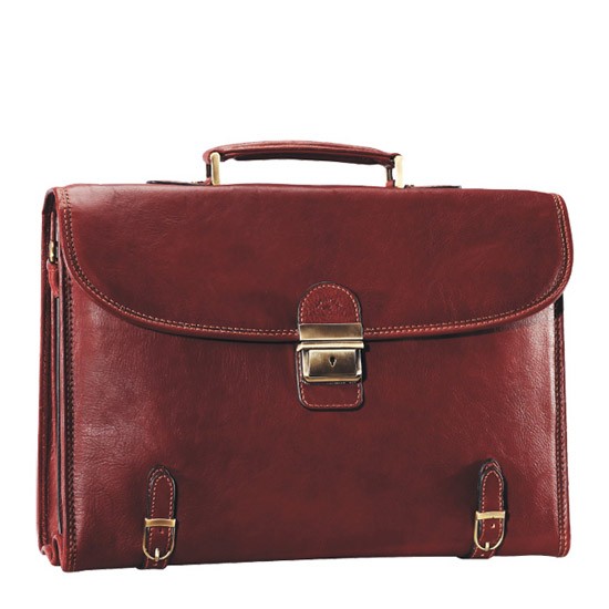 Ce cartable trois soufflets en cuir de vachette gras peut se porter à la main ou sur l'épaule grâce à sa bandoulière amovible. Il dispose à l'intérieur de trois compartiments et d'une poche à fermeture éclair ainsi que d'espaces de rangement pour stylos, porte-clés et téléphone portable. Des poches supplémentaires dont plusieurs à fermeture éclair se trouvent de chaque côté du cartable.