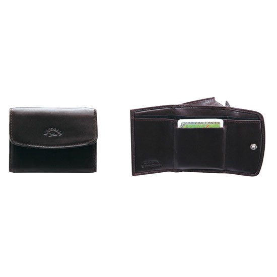 Porte-feuille en cuir de vachette souple gras disposant d'une poche extérieure pour la monnaie ainsi qu'une poche à billets et d'un compartiment cartes à l'intérieur.